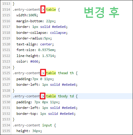 구문강조 자바스크립트에서 사용하는 table과 티스토리 내 table의 CSS가 강제로 참조되는 문제라고 한다.