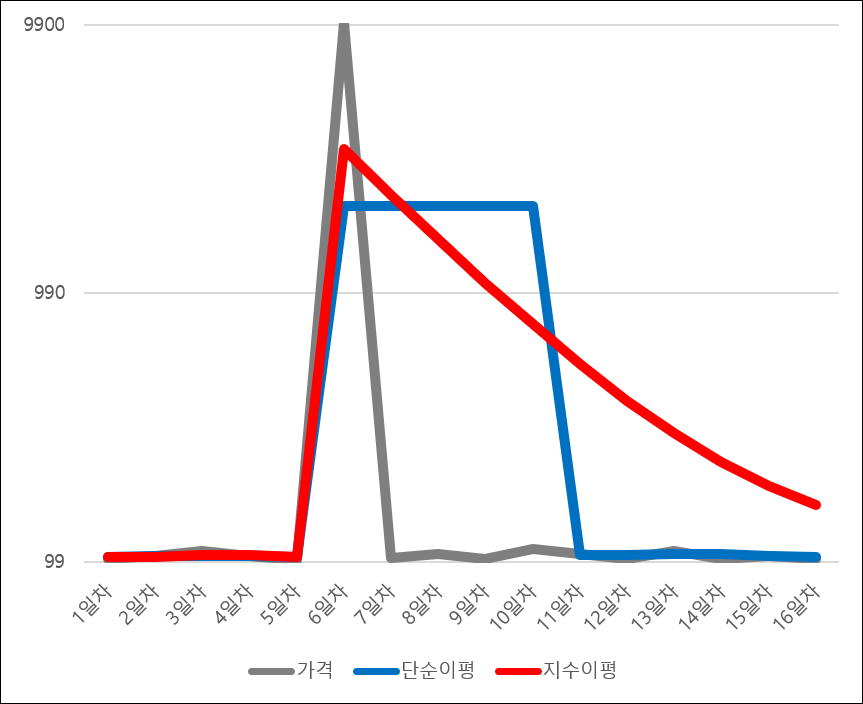 - 단순이동평균은 6일차에 갑자기 상승하여, 쭈~욱 유지하다가 10일차에 갑자기 하락한다.