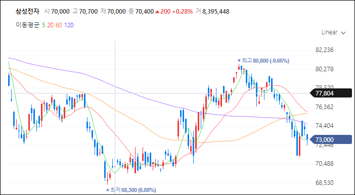 5일, 20일, 60일, 120일 평균이 주로 사용되며, 흔히 만나게 되는 이동평균을 의미한다.